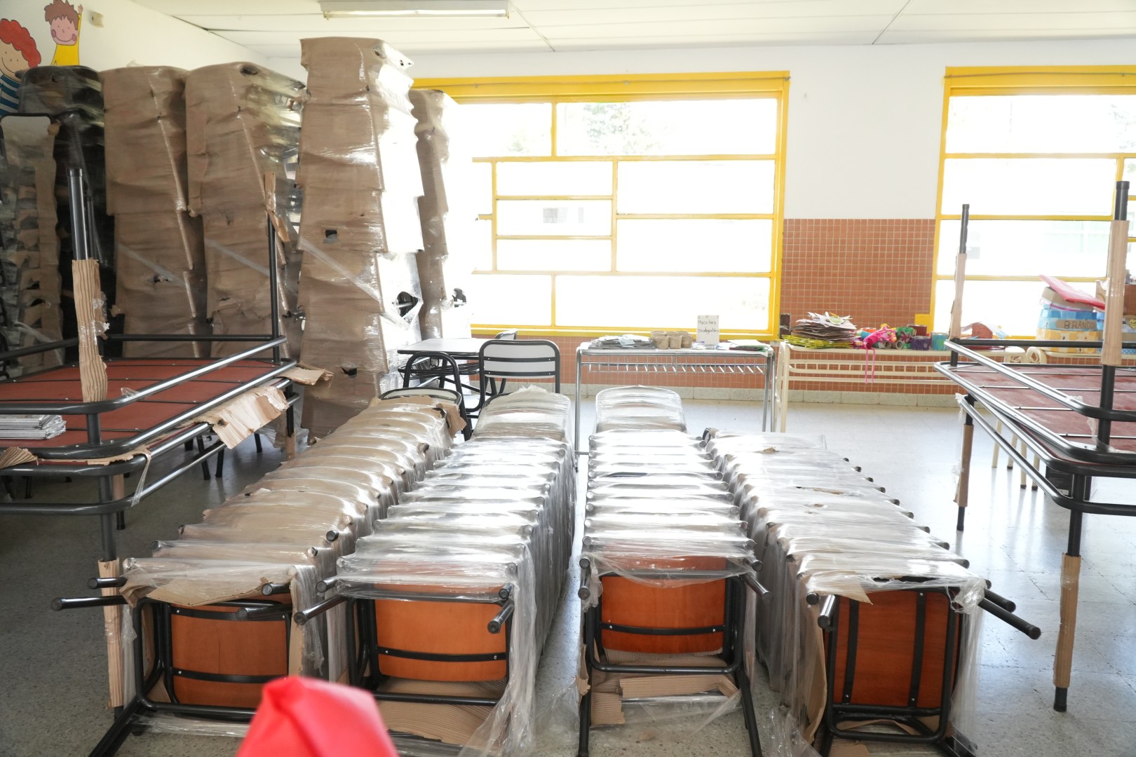 20 pupitres | 20 sillas | 4 mesas comedor | 2 pizarras de fibra | 1 armario